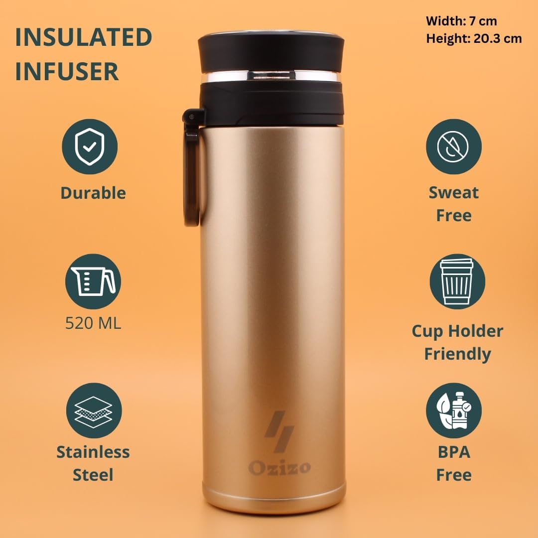 Ozizo 18 oz Infusion Mug, Elegant Double Wall Insulated Thermos with Infuser & Tea Leaf Filter Experience the perfect blend of style and functionality with the Ozizo 18 oz Infusion Mug, a premium double-wall vacuum insulated stainless steel thermos designed to keep your drinks at the ideal temperature for hours. Whether you enjoy hot coffee, herbal tea, or refreshing cold brews, this infusion tumbler is your go-to companion. Crafted with a mirror-like finish, this infusion mug is as stunning as it is practical. It comes with a stainless steel infuser and a fine tea leaf filter cup, making it perfect for brewing loose tea leaves, herbal infusions, or fruit-infused water. The included filter and infuser ensure a smooth and flavorful drink every time. Perfectly sized for home, office, or travel, the Ozizo infusion mug with lid prevents spills while maintaining the temperature of your favorite beverages. Whether you're using it as a loose tea infuser, a coffee thermos, or a hot and cold bottle, this infuser cup is designed for versatility and elegance. Upgrade your tea and coffee experience with the Ozizo Infusion Mug, where beauty meets functionality!
