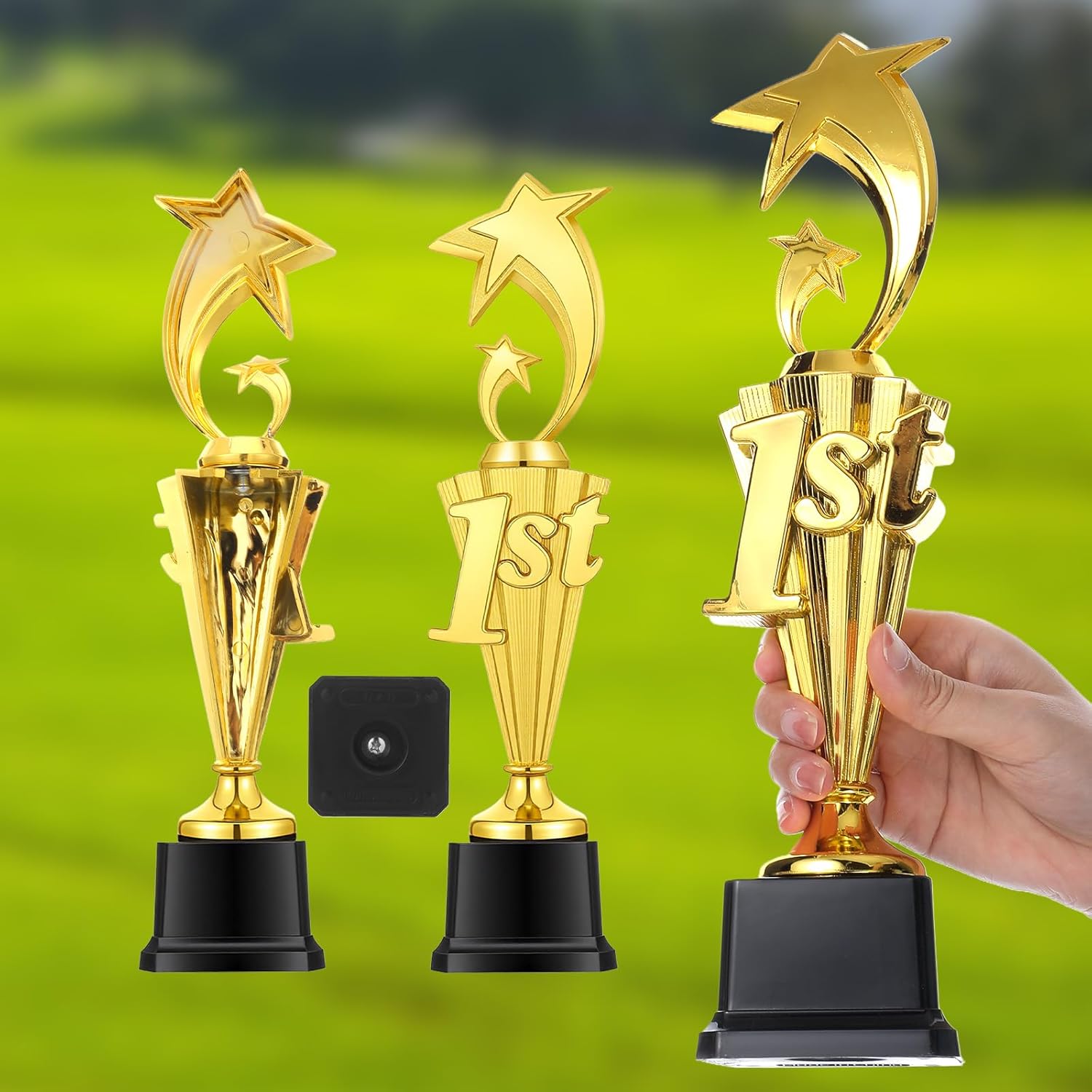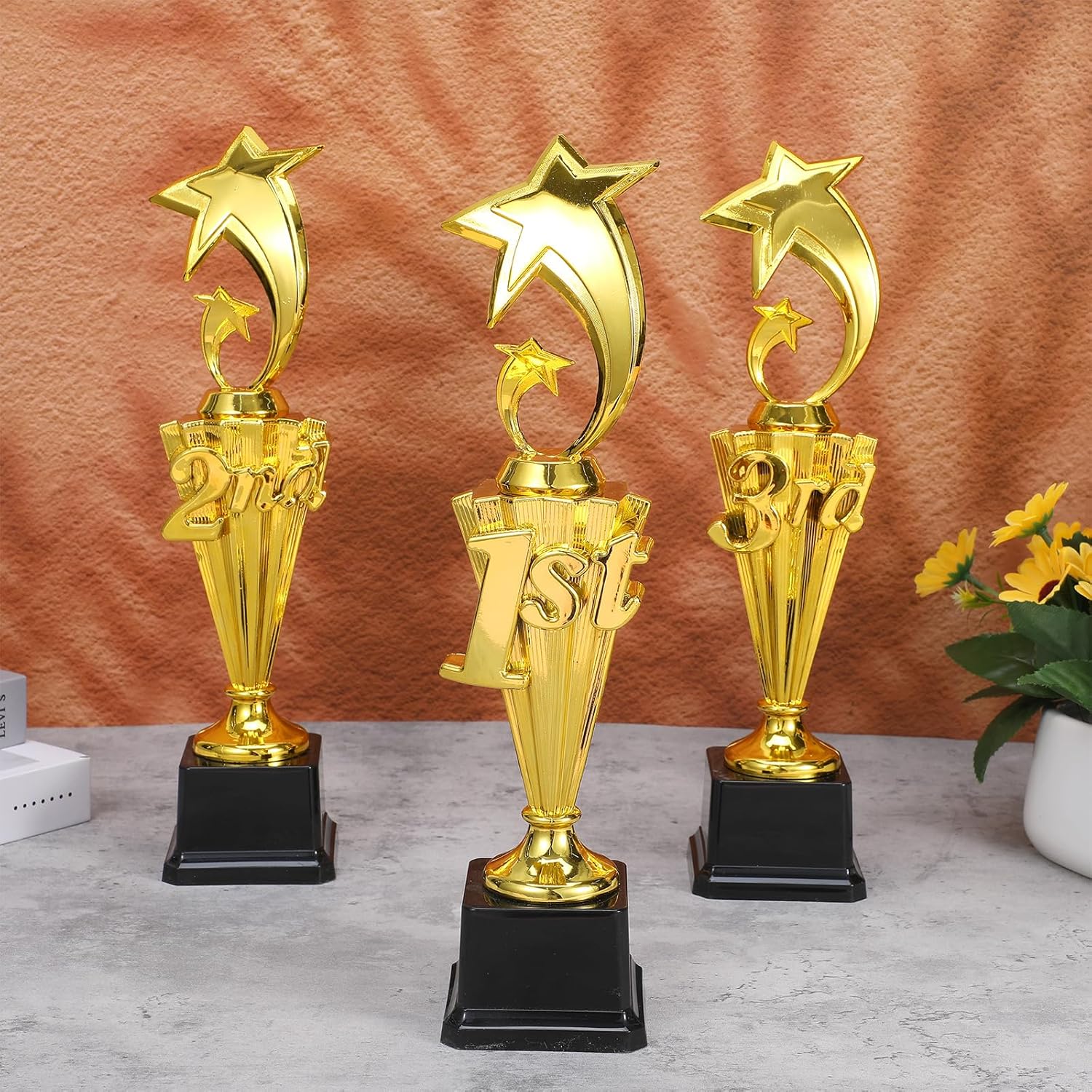 Welcome to our store!Features:Playful Celebration: This fun trophy adds a joyful touch to any party, whether it's a birthday celebration or a family game night. Its exquisite design makes it an ideal mini trophy, and its unique design is also appealing to adults.Versatile Event Recognition: This trophy is suitable for a variety of events, such as basketball, baseball, and even soccer games. It can also be used as a trophy for dance competitions or as a decoration for talent shows.Specifications:Material: PPColor: GoldSize: 12.6 x 2.95 inchesSuitable For: Football Soccer Competitions Reward CeremonyPackage Includes:3 Pcs x 3rd 2nd 1st Place TrophyNotes:Manual measurement, please allow slight errors on size.The color may exist a slight difference due to different screen displays.