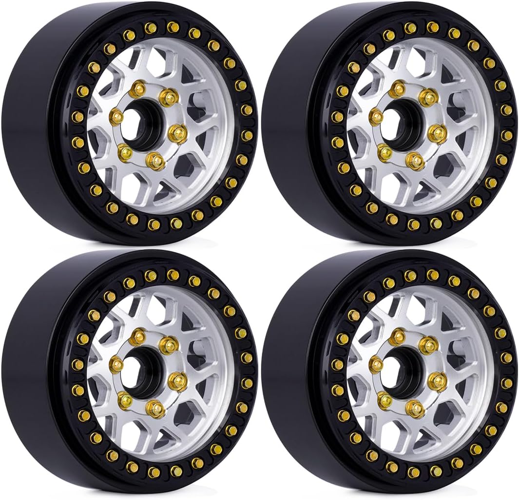 Description: 1.9 Beadlock design,don't need to glue Quality aluminum alloy, CNC machined Gold, Silver, Red/Black anodized Rapid fast tire changes with 6 screws Negative offset -3.1mm, widen wheel spacing and provide better stability Fits 12mm hex hubs and most 1.9 inch size tires (Single wheel hub: 24 M2 * 4 gold outer hexagonal screw lock outer rings, 6 M3 * 8 gold outer hexagonal screw lock connectors, 6 M3 * 8 cup head screw lock rear pressure rings) External hexagonal screwdriver included Specifications: Material: Aluminum Alloy Category: 1.9inch Wheel hub Colors: black red, black silver, black gold Quantity: 4PCS Outer Diameter: 56.7mm (2.23in) Inside diameter: 44.8mm (1.06in) Width: 27mm(1.06in) Center Hole: 7mm(0.28in) Drive Hex: 12mm (0.47in) Offset: -3.1mm (-0.12in) Weight: 82.4g/pcs (2.91oz) Packing weight:378g(13.33oz) Package List: 4 * RC Car 1.9" Wheel Rims