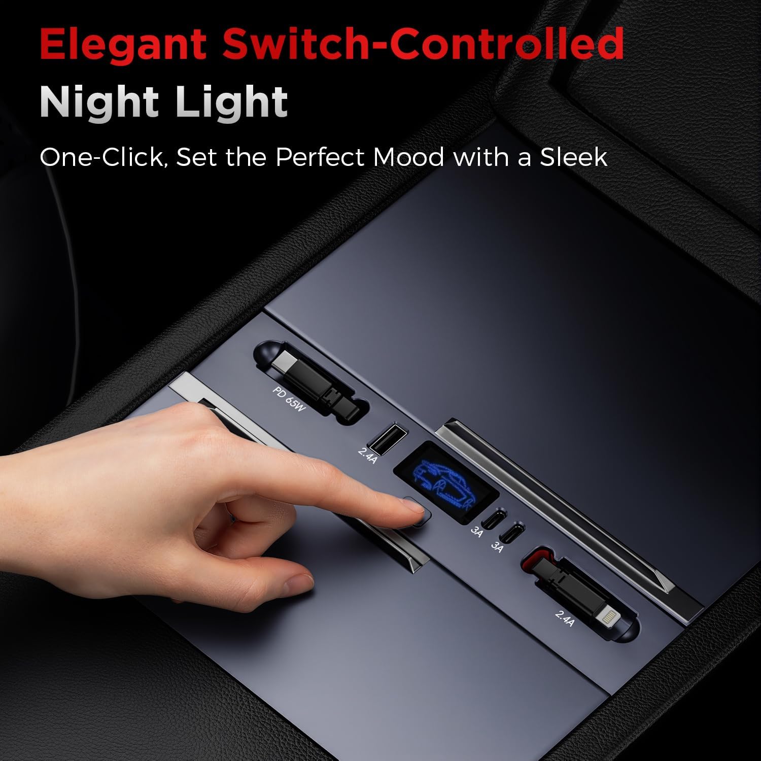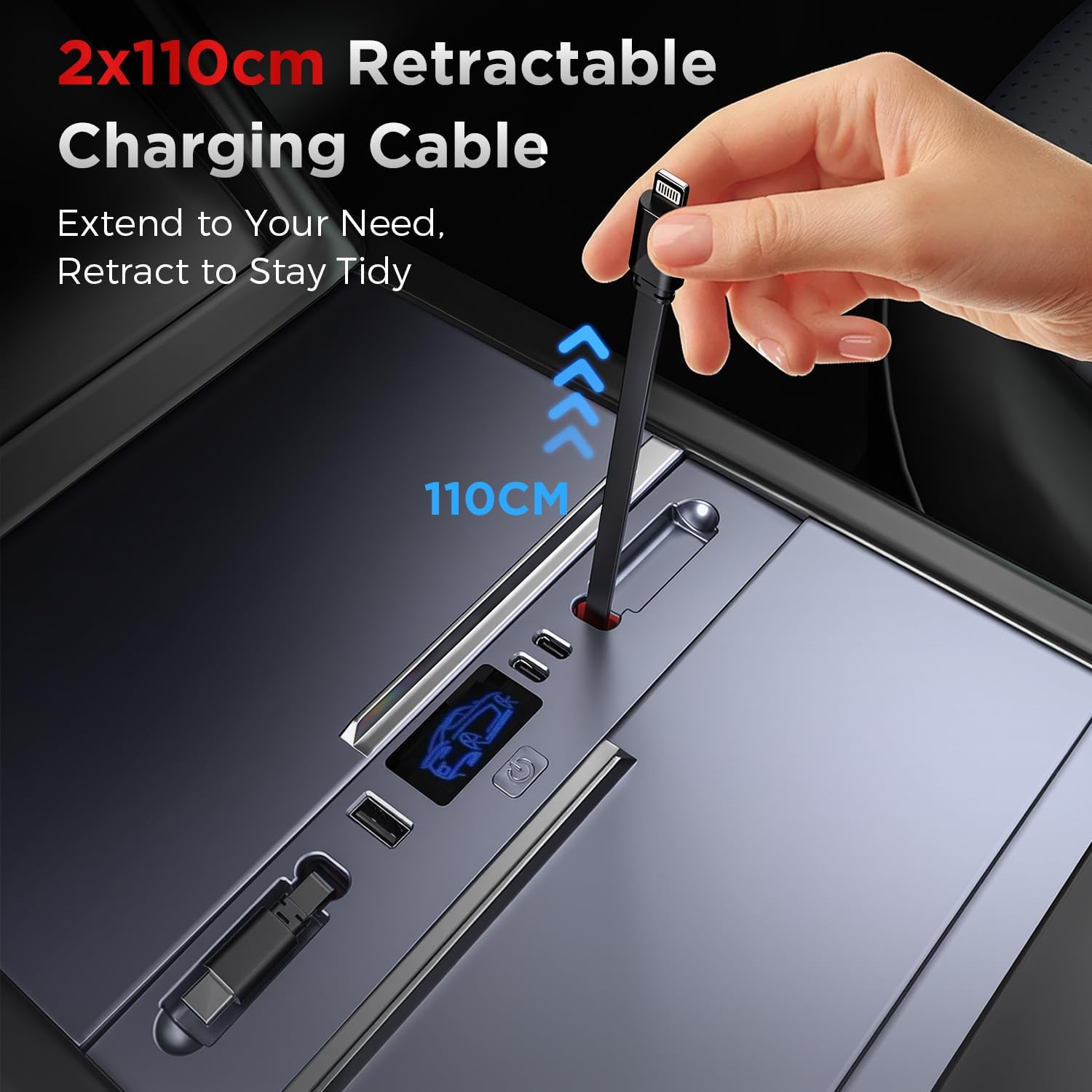 Vellhezy 65W USB Charger Hub for Tesla Model Y Juniper 2026 & Model 3 Highland 2024 2025 Accessories, Fast Charging with Retractable Cables, 5-Port USB Charger Docking Station fit Tesla Center Console