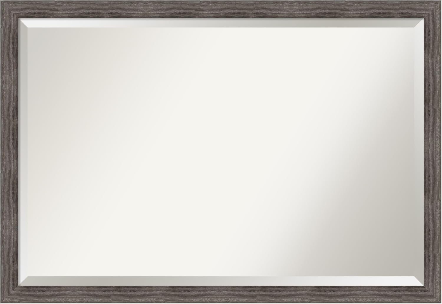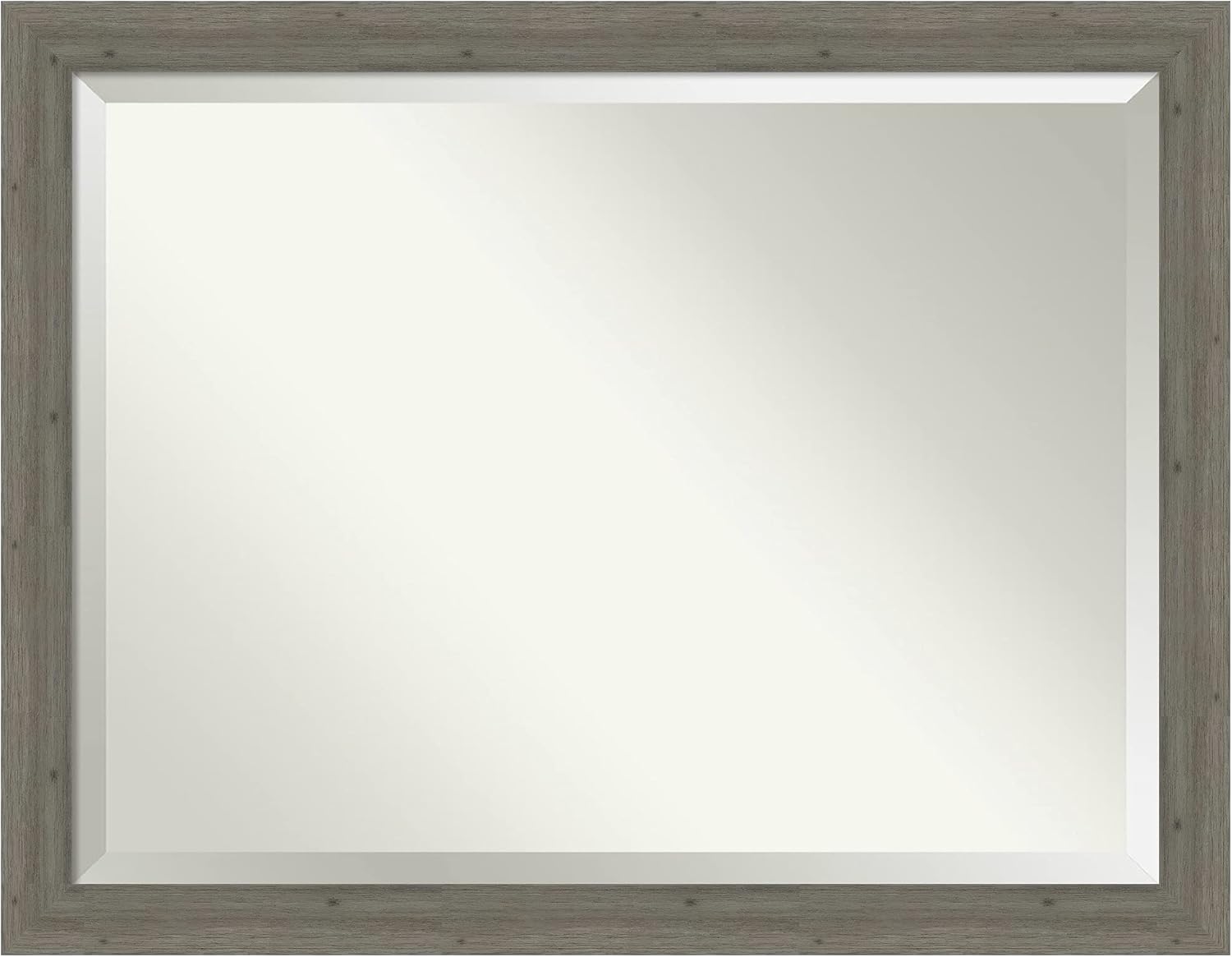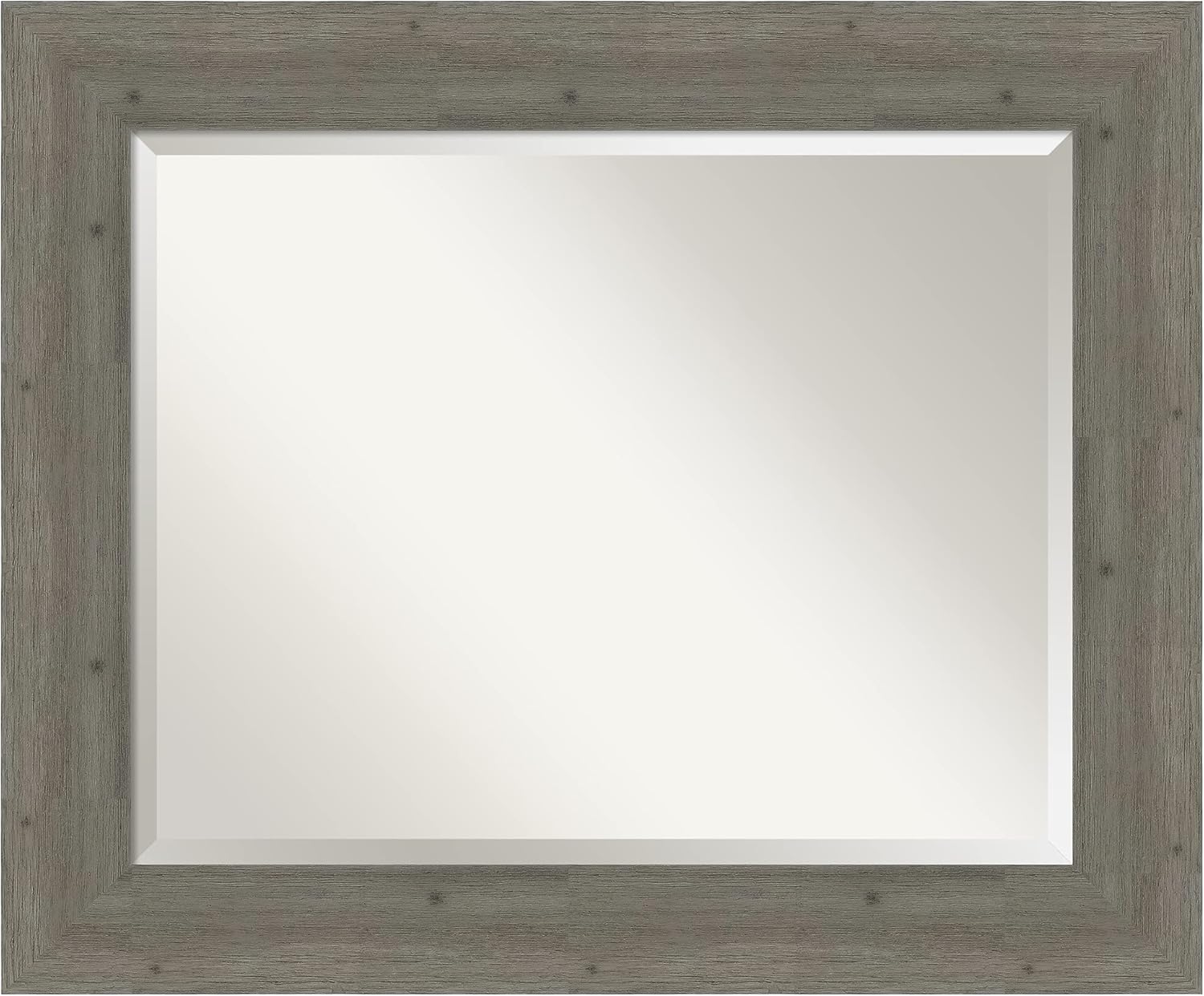 PRODUCT: Amanti Art Beveled Wood Wall Mirror; OUTER SIZE: Exactly 32.75 x 26.75 inches; FRAME: Regis Barnwood Grey; FRAME FINISH: Distressed; FRAME COLOR: Grey. The Regis Barnwood Grey frame is a grey-washed, distressed frame, with distinctive weathering and a higher outer edge. Give your home or office the finishing touch with this 100% real wood-framed wall mirror. Individually made using traditional custom framing techniques, it has the quality you would expect from your local frame shop. It holds its value with premium finishing that can be appreciated up close. Because of our attention to detail and focus on artistry, architects, interior designers, and homeowners alike choose this mirror to create beautiful living spaces.