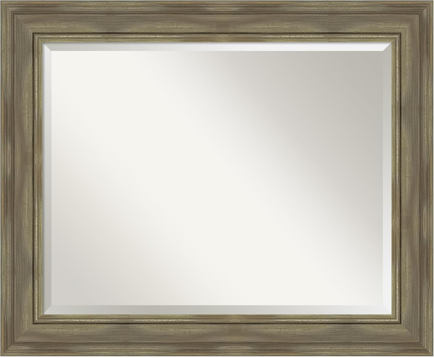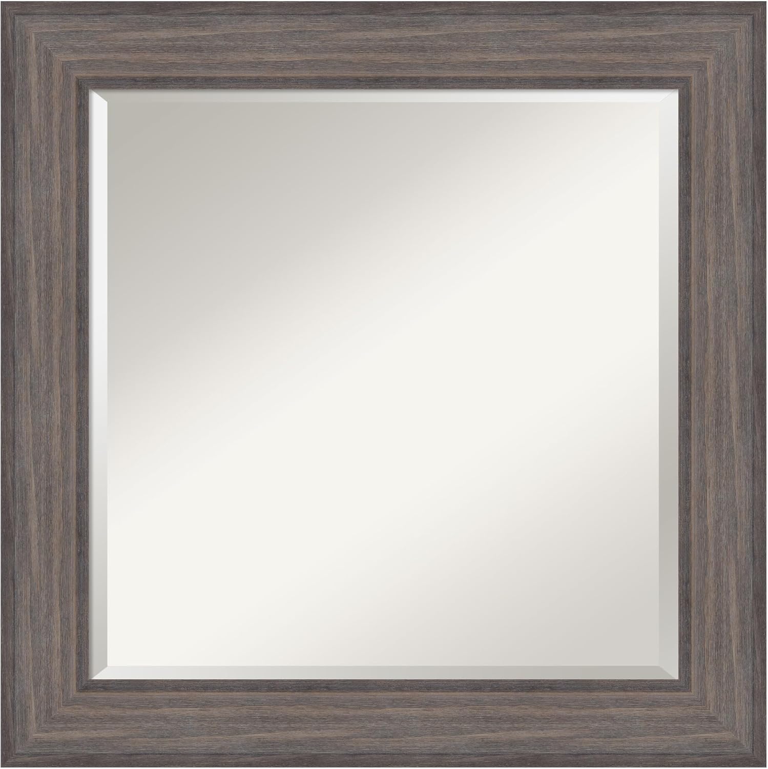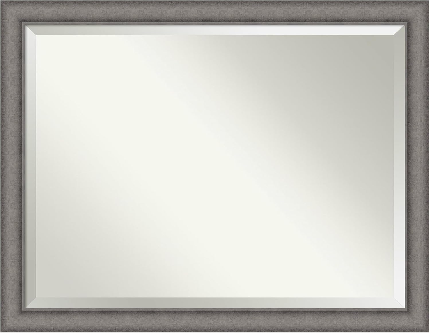 PRODUCT: Amanti Art Beveled Wood Wall Mirror; OUTER SIZE: Exactly 32.75 x 26.75 inches; FRAME: Regis Barnwood Grey; FRAME FINISH: Distressed; FRAME COLOR: Grey. The Regis Barnwood Grey frame is a grey-washed, distressed frame, with distinctive weathering and a higher outer edge. Give your home or office the finishing touch with this 100% real wood-framed wall mirror. Individually made using traditional custom framing techniques, it has the quality you would expect from your local frame shop. It holds its value with premium finishing that can be appreciated up close. Because of our attention to detail and focus on artistry, architects, interior designers, and homeowners alike choose this mirror to create beautiful living spaces.