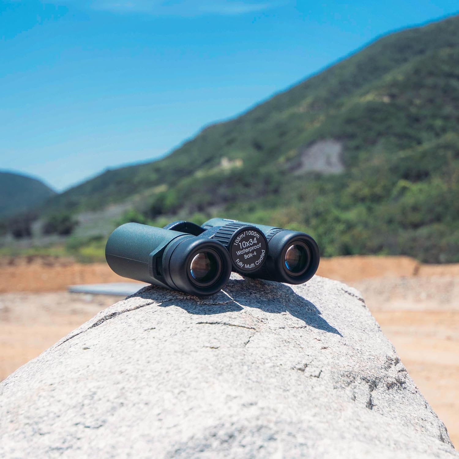 The 10x34 air view binoculars is a compact binocular designed to excel under conditions that require lightweight portability and carrying comfort. An open-bridge design provides viewers with long-term viewing comfort and enhanced stability, while fully multi-coated optics BaK-4 Prism glass deliver unparalleled clarity and color. Feature a central focusing knob that allows for smooth focusing and easy operation. Comes O-ring sealed and Nitrogen Purged to eliminate any possibility of internal fogging and is 100 percent water proof. Shock-absorbing rubber Armor provides protection to the optics and creates a non-slip ergonomic design. The compact size of the 10x34 air view binoculars allow them to be transported easily without being cumbersome, and a lightweight design lends itself well to hiking, bird watching, and other outdoor activities. Features an attachment point to place on a tripod. Backed by limited Lifetime . Includes carrying case, neck strap and lens cloth.