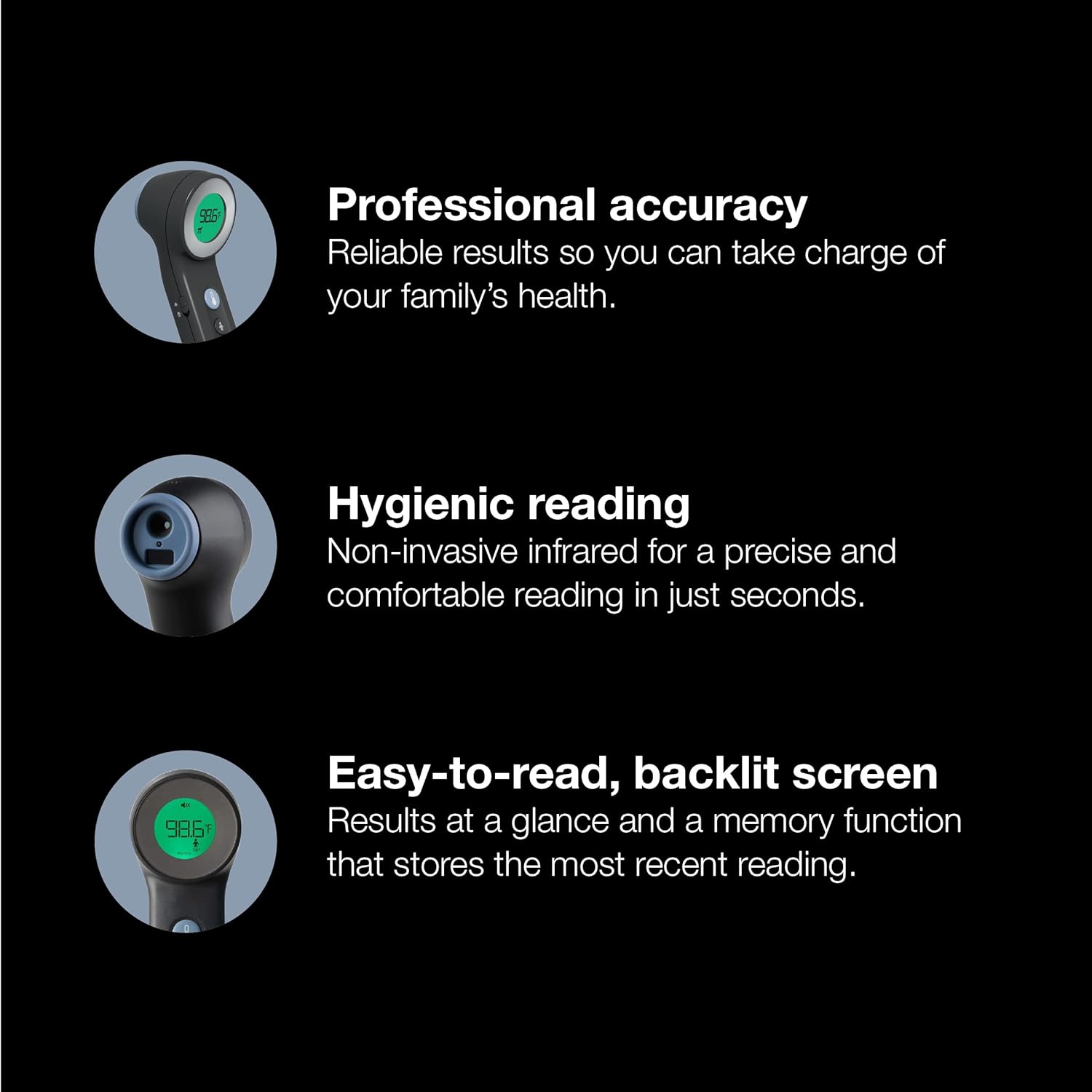 Get clinically validated accuracy from the #1 Brand recommended by pediatricians1 with the Sensian™ 7 Forehead non-contact thermometer. In as fast as two seconds, it accurately measures not only body temperature but also food and liquid temperatures, such as bath and milk. Making it a 3-in-1 thermometer that’s ideal for the entire family. Its ergonomic, fool-proof design features our PositionCheck™ technology made to ensure the proper positioning and our Age Precision® technology correctly interprets the measurement according to age (0-3 months, 3-36 months, or 36+ months). It also includes a color-coded LCD display designed to quickly indicate if a fever is present, a silent mode that allows you to take temperatures quietly while your loved ones rest and recover, and a quick start guide for reference to ensure proper thermometer placement to get the most accurate results. Comes equipped with a protective cap and two AAA batteries. Gentle on babies, precise for the entire family— it’s accuracy made easy. 1) Based on survey reporting that of surveyed pediatricians who recommend a brand of thermometers, Braun is the most recommended 2) Age-based fever thresholds gave significantly better estimates of illness than fixed fever -Kasbekar R, Naz A, Marcos L, et al. Threshold for defining fever varies with age, especially in children: A multi-site diagnostic accuracy study. Nursing Open 2021-8-2707 2721 (Study sponsored by Kaz USA, Inc.). Herzog L, Phillips S. Addressing Concerns About Fever. Clinical Pediatrics. 2011; 50(#5): 383-390 *Pointing between the eyebrows at max 1in distance from forehead is critical for reading accuracy.