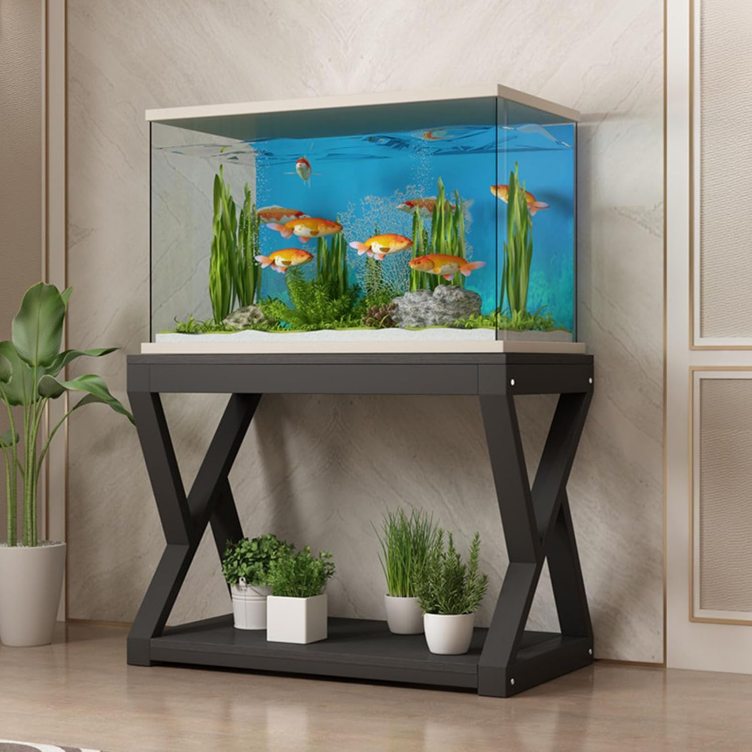 Product FeaturesSturdy load-bearing capacity ensures aquarium stability without wobblingOpen design facilitates easy access to itemsRobust construction guarantees durability and resistance to deformationMinimalist black-and-white aesthetic offers both visual appeal and versatilityCompact footprint maximises space utilisationErgonomically designed height facilitates viewing, feeding and routine maintenanceSimple assembly requires no specialised tools, enabling swift completion by a single personProduct Name: Aquarium StandMaterial: Steel frame + eco-friendly boardLength: 40/50/60/80/90/100/120 cm (15.7/19.7/23.6/31.5/35.4/39.4 inches)Width: 40/50 cm (15.7/19.7 inches)Height: 70 cm / 27.6 inchesAssembly Required: YesPackage Contents1 x Aquarium Base (aquarium tank not included)Important NotesThis product is solely an aquarium base; the aquarium tank itself is not included.Dimensions are manually measured and may vary by 1-3 cm from the actual product.Colours may appear slightly different due to screen display variations; the actual product colour shall prevail.