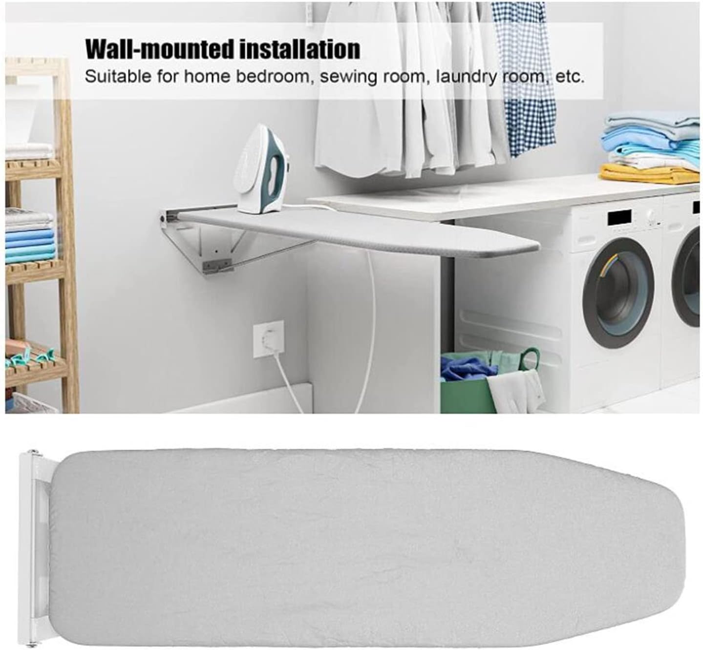 High quality, beautiful and valuable ,an adult can easily unfold and fold the ironing board Advantages: ---White sprayed iron material, not easy to rust, strong load-bearing capacity, to ensure a safe and secure ironing process ---Wall-mounted foldable design, hold up when used, put away when idle, convenient to use and save space --- anti-scalding cloth cover is resistant to high temperature and easy to clean ---Introduction to the design, simple installation and convenient operation Features: *The whole parts are made of thick white sprayed iron *The full anti-scalding cloth cover is fixed to the metal plate surface *Installed on the wall, foldable when not in use *Connected to the cabinet by screws, the installation steps are simple Product size L length * width * H height(MM/INCH):L1070xW300xH35mm Main material: high-quality iron parts, anti-scalding cloth cover Surface treatment: white spray