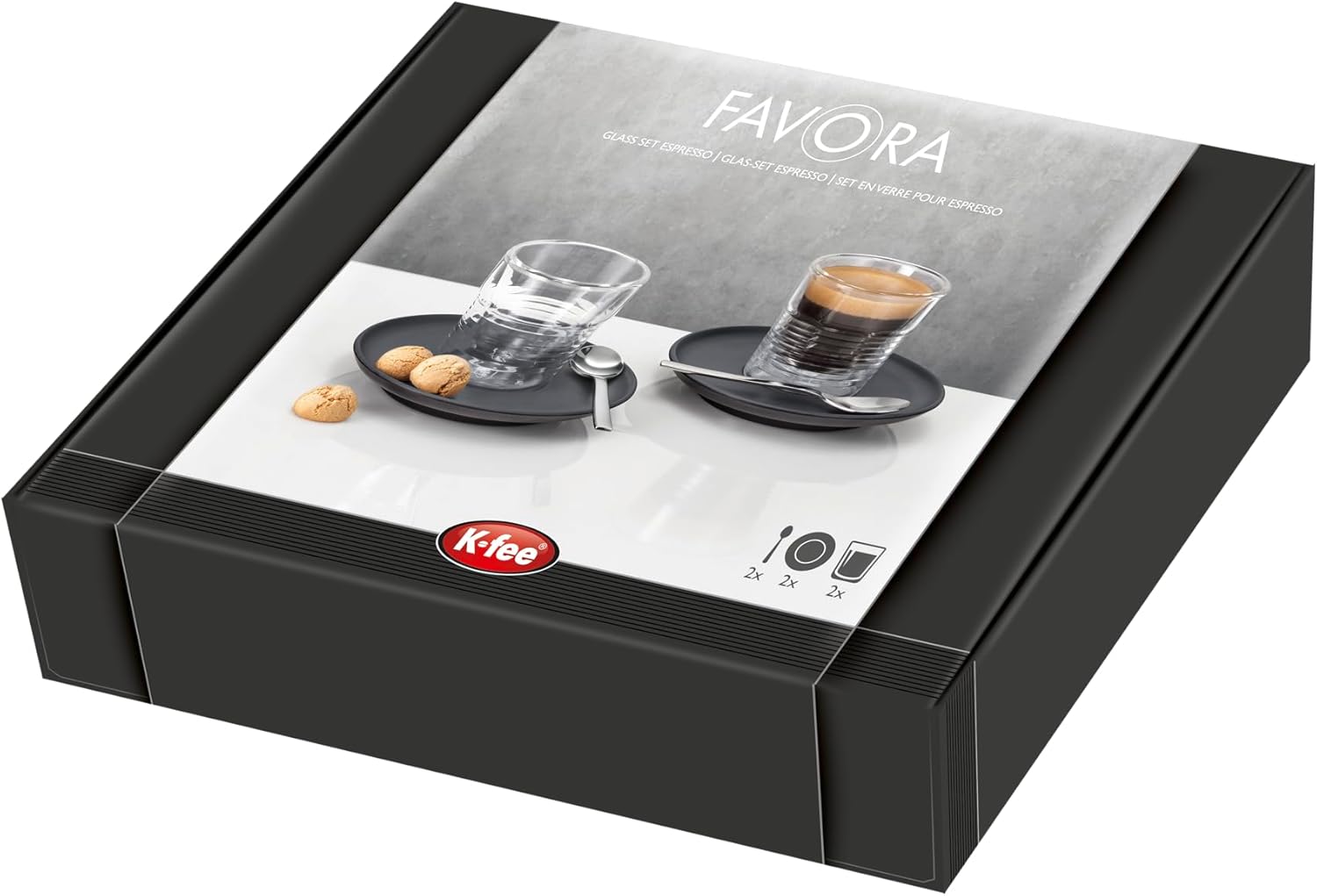 Hand-blown espresso glasses from K-fee Powerful espresso with a fine crema is already a pleasure in itself. But if this is now also visible in an elegant espresso glass, the moment of enjoyment becomes many times greater. With the espresso glasses from K-fee, the coffee stays hot for much longer. The glasses are double-walled and an insulating air layer is enclosed between the two layers of glass. This prevents the heat from being released to the glass. This keeps the espresso hot and the hands cool on the outside. Thanks to the borosilicate glass material, the glasses are dishwasher-safe, durable and heat-resistant. At 75 grams, they are lighter than other espresso cups. The K-fee typical wave design is reminiscent of our capsules and makes the elegant glasses a real eye-catcher. The espresso glasses fit up to the rim 70 ml. The perfect capacity is 50 ml. With a height of 63 mm, the glasses fit under all K-fee capsule machines.