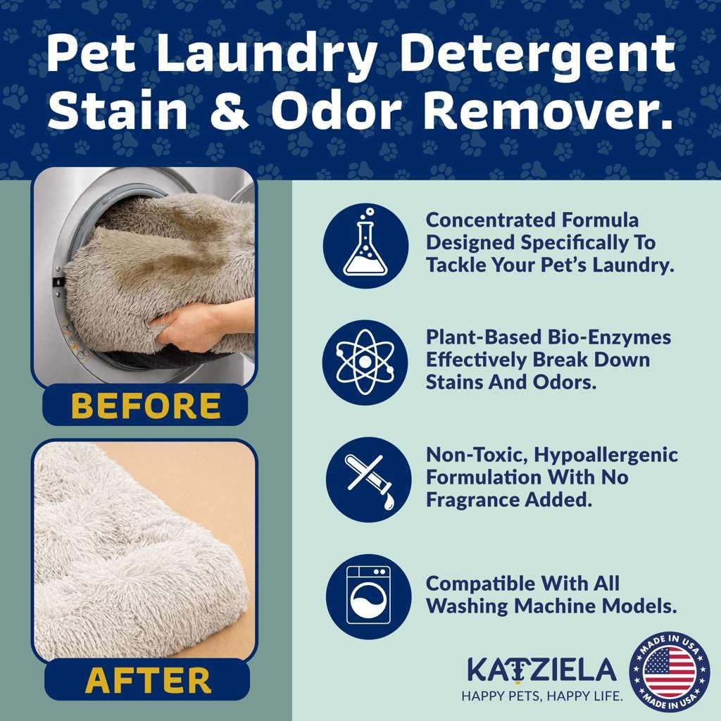 Pets bring love — and a lot of laundry. From dog beds and blankets to reusable pee pads and everyday clothing, pet fabrics collect odors, drool, and tough organic messes that regular detergents simply don’t remove. That’s why we created Katziela Pet Laundry Detergent, a concentrated enzymatic powder designed specifically for the items your pets use most. Our formula blends natural bio-enzymes with oxygen-based cleaning power to break down the real sources of pet odors — urine residue, body oils, saliva, feces stains, and deep-set fabric buildup. The result is cleaner, fresher laundry without heavy perfumes or harsh additives. Unlike typical detergents made for human clothing, Katziela is engineered for the unique challenges of pet fabrics: thick beds, fleece blankets, crate pads, pee pads, and heavily used soft surfaces. It dissolves completely in HE and standard washers, rinses clean, and leaves no sticky residue on fabrics. This is an honest, straightforward detergent that does exactly what pet families need — removes tough smells, lifts stains, and restores freshness to the fabrics your pets use every day.