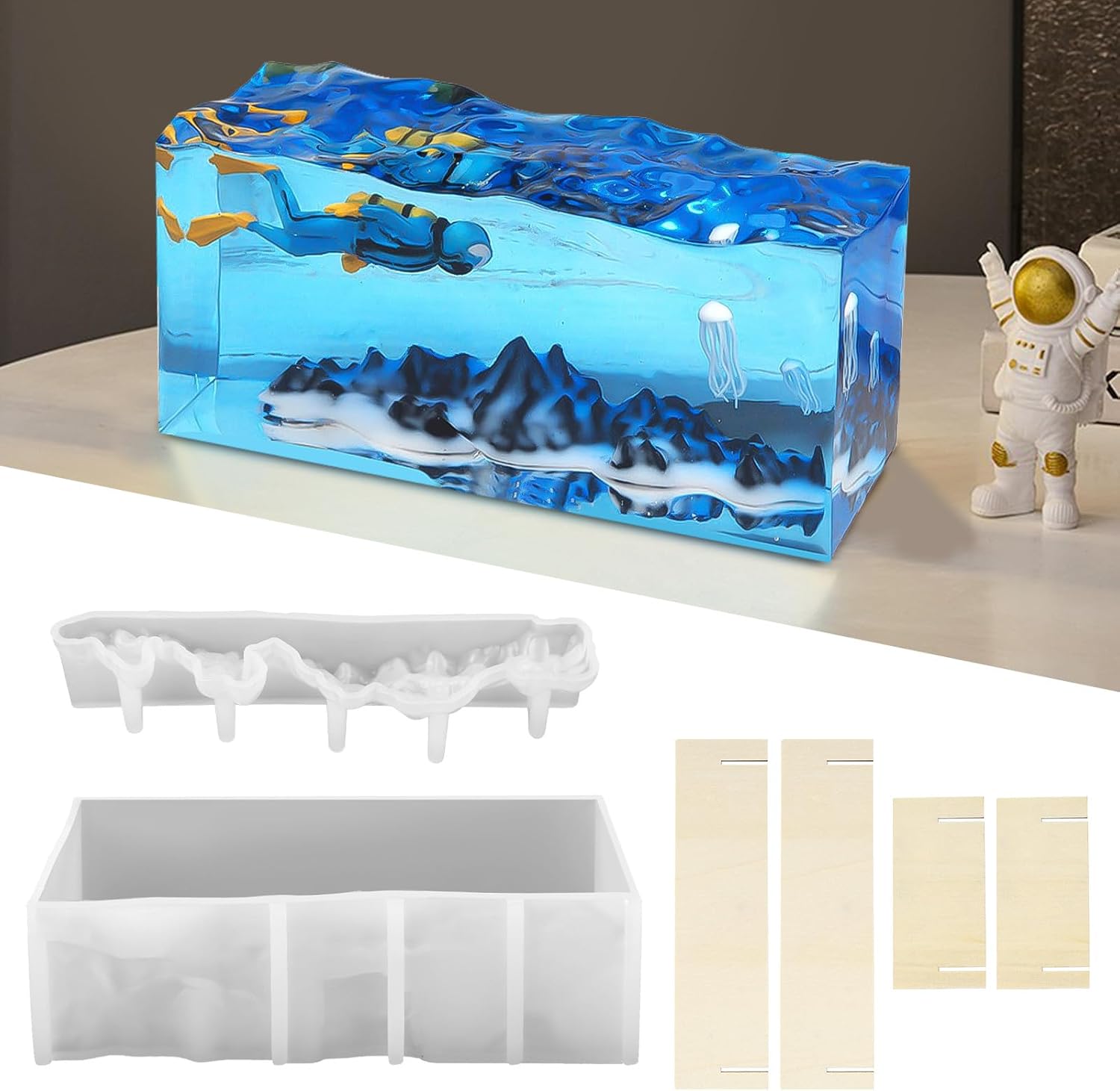 Specification: - Material: Silicone - Color: Translucent - Shapes: Mountain Sea Wave shape - Package includes: 2 pieces resin molds, 1 piece wooden bases and 1 LED lamp accessories. Size : ☀ Rectangle mold: 15.1x7.4x4.7cm/5.9x2.9x1.9inch ☀Mountain Mold: 13x2.8x2.5 cm/5.1x1.1x1inch Features: -Make crafts according to your own preferences, it can be a wonderful underwater world or a beautiful landscape painting. -The intensity of the light emitted by the night light is related to the transparency and brightness of the epoxy resin. - Resin-mold is made of silicone, safe and can be reused after cleaning. - Creative handmade pour with kinds of dry flower, pigments filler, sequins and beads to create your own unique lamp crafts. - The resin lamp perfect for various decoration in different occasion, beautiful and creative. - DIY a unique Christmas, birthday, Halloween, thanksgiving gift to family and friends.