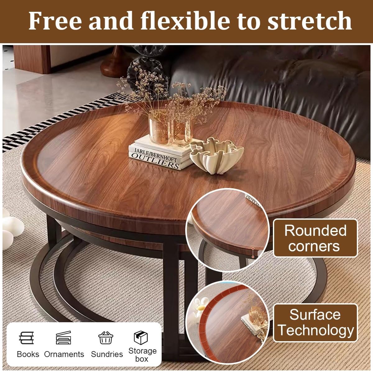 Wood Nesting Tables — Big Style for Small SpacesElevate your living room with this round nesting coffee table set of 2 — where rustic charm meets smart functionality. Crafted from sustainably-sourced solid wood, these nesting coffee tables for living room feature a warm natural grain that only improves with age. The innovative stackable coffee table design allows the smaller table to disappear completely under the larger one, creating the ultimate coffee table for small space solution for apartments, lofts, and cozy homes. Industrial-Strength Metal Base : Reinforced blackened steel legs with anti-tip crossbars Silent Glide System : Felt-lined nesting mechanism ensures smooth stackable tables operation Rounded Edge Design : Radius-edged round coffee table set prevents shin bruisesInstant Living Room TransformationYour new modern round nesting coffee table serves multiple roles:Coffee Station : Combine tables for brunch gatheringsBook Lover's Paradise : Separate as twin living room nesting tables flanking your sofaProduct informationBrands:ValdozaTable Design:round nesting coffee tables living roomLeg Style:MetalStyle Name:ModernMaterial Type:Wood and MetalProduct Care Instructions:Damp clothBase: MetalTop Material Type:WoodSize:50+70cm/19.6+27.5in , 60+80cm/23.6+31.4in