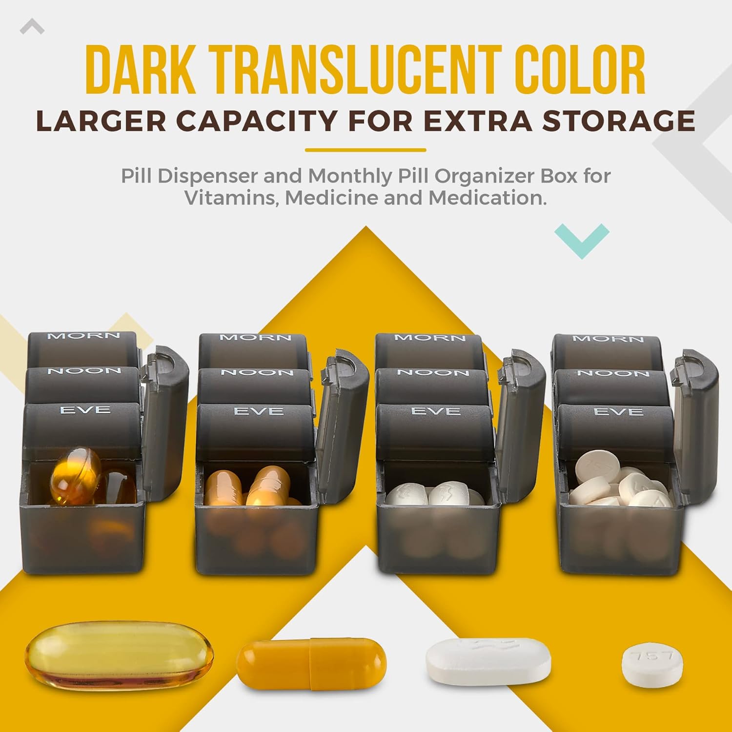 Do you have a hard time keeping track of all your daily medications? Have you been searching for a new way to help you remember your morning, afternoon and evening meds? Then your search is over! The MEDca 31 day pill organizer features translucent black see through compartments you will be able to check to see if you have taken your pills for the day and you won't have to keep multiple pill boxes.COMPARTMENTS MARKED CLEARLY FOR YOUR CONVENIENCE Secure and Compact Compartments that a ideal for individuals with memory loss, elderly senior people, those under multiple medications, or haven't been taking their prescribed medications. PILL DISPENSER FEATURES:32 Numbered CompartmentsBlack Translucent ColorRemovable 4-Times-A-Day Daily Pill CasesMorning-Noon-Evening-NightBPA Free, Safe & Non-Toxic Food Grade PPTravel FriendlyDurable Quality ConstructionIdeal home health care living aid for the elderly, seniors and all ages. When looking for new health management solutions it can be difficult to find products that are trustworthy, safe, and effective. MEDca offers only premium quality home health aides and we guarantee that you will be absolutely happy with your purchase.
