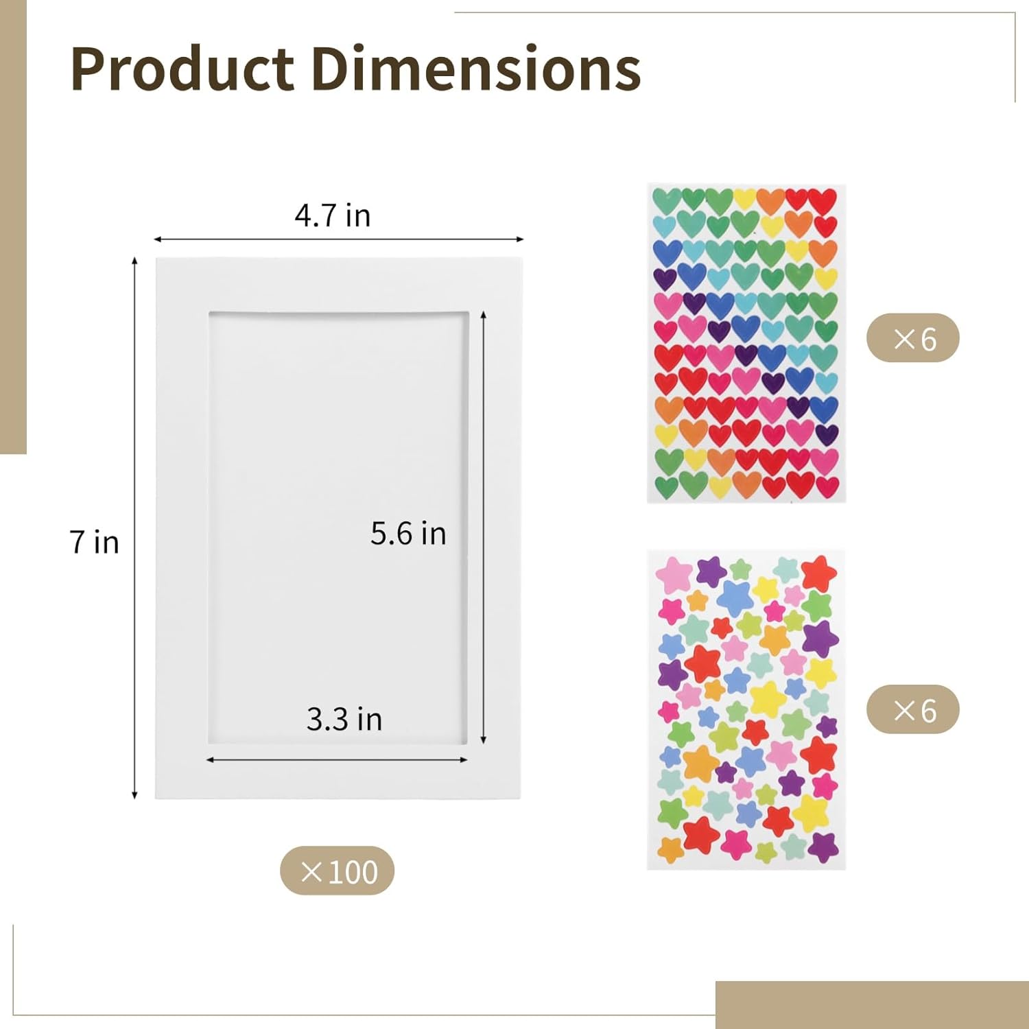 Color: White Material: Paper Size: Photo Frame Size: 4.7 x 7 in Package Includes: 100 x Photo Frame,12 Sheets of Stickers Note: - Please refer to the measurement. Tiny measuring error is allowable in normal range. - There might be a little color difference due to the monitor, camera or other factors, please refer to the physical item.