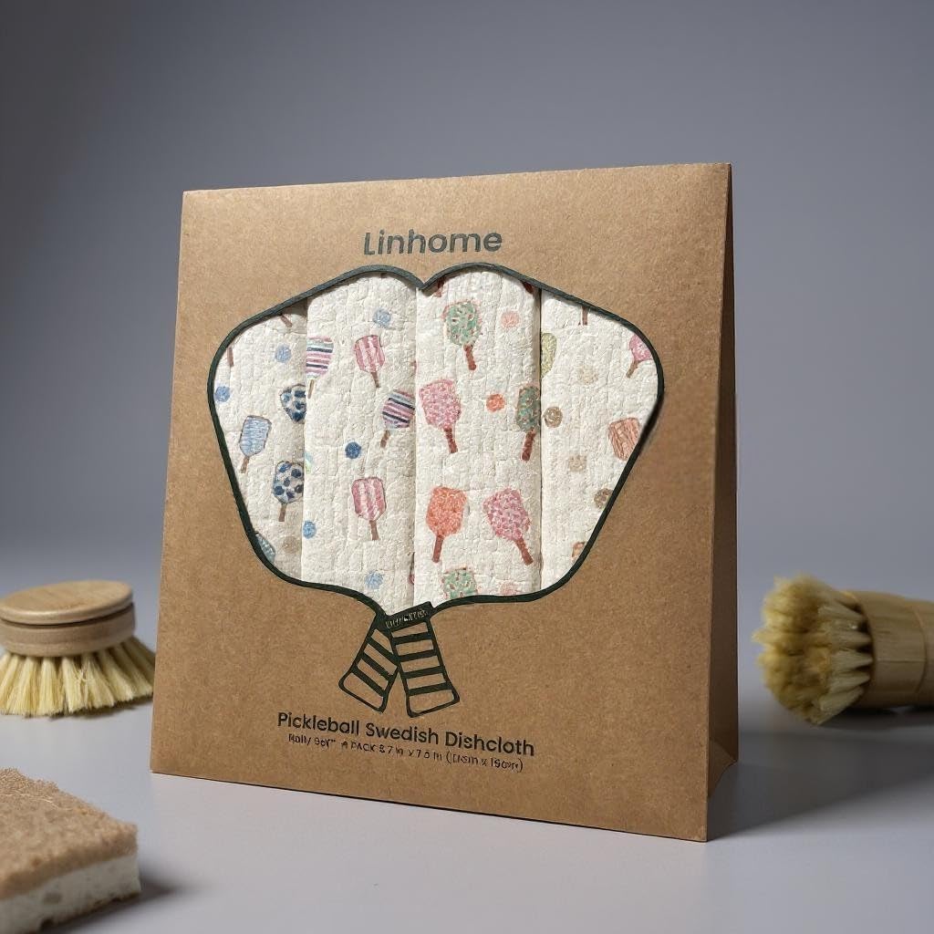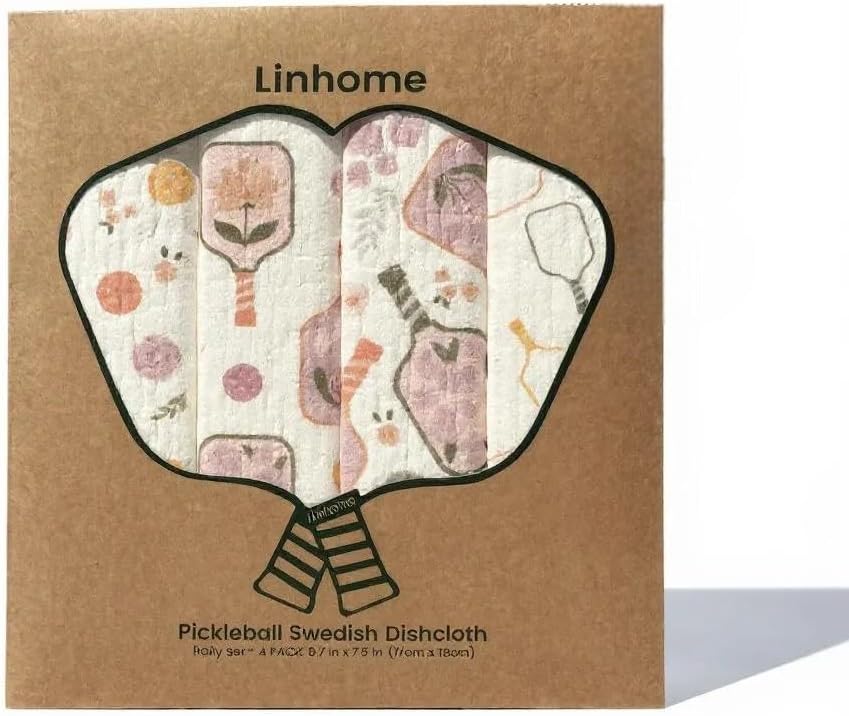 Transform your kitchen cleaning routine with these charming Linhome Swedish dishcloths featuring a delightful pickleball-themed pattern in soft pastel colors. These reusable cleaning cloths combine style with functionality, offering a sustainable alternative to traditional paper towels. Made from highly absorbent cellulose material, they're perfect for wiping counters, cleaning spills, and handling everyday kitchen messes. The durable construction allows them to be washed and reused multiple times while maintaining their effectiveness. Each cloth showcases a whimsical design of patterned pickleballs in blue, pink, and green stripes, complemented by orange handles and polka dot accents on a clean white background. Dishwasher-safe for easy cleaning, these versatile cloths work great for both wet and dry cleaning tasks. Their non-scratch material makes them safe to use on various surfaces throughout your home. The perfect blend of practicality and playful design makes these Swedish dishcloths an excellent addition to any kitchen.