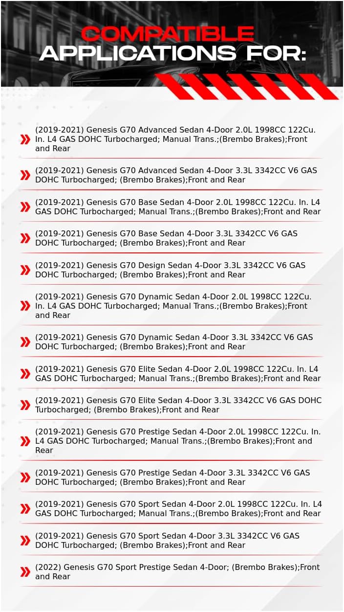 Compatible Applications for:(2019-2021) Genesis G70 Advanced Sedan 4-Door 2.0L 1998CC 122Cu. In. L4 GAS DOHC Turbocharged; Manual Trans.;(Brembo Brakes);Front and Rear(2019-2021) Genesis G70 Advanced Sedan 4-Door 3.3L 3342CC V6 GAS DOHC Turbocharged; (Brembo Brakes);Front and Rear(2019-2021) Genesis G70 Base Sedan 4-Door 2.0L 1998CC 122Cu. In. L4 GAS DOHC Turbocharged; Manual Trans.;(Brembo Brakes);Front and Rear(2019-2021) Genesis G70 Base Sedan 4-Door 3.3L 3342CC V6 GAS DOHC Turbocharged; (Brembo Brakes);Front and Rear(2019-2021) Genesis G70 Design Sedan 4-Door 3.3L 3342CC V6 GAS DOHC Turbocharged; (Brembo Brakes);Front and Rear(2019-2021) Genesis G70 Dynamic Sedan 4-Door 2.0L 1998CC 122Cu. In. L4 GAS DOHC Turbocharged; Manual Trans.;(Brembo Brakes);Front and Rear(2019-2021) Genesis G70 Dynamic Sedan 4-Door 3.3L 3342CC V6 GAS DOHC Turbocharged; (Brembo Brakes);Front and Rear(2019-2021) Genesis G70 Elite Sedan 4-Door 2.0L 1998CC 122Cu. In. L4 GAS DOHC Turbocharged; Manual Trans.;(Brembo Brakes);Front and Rear(2019-2021) Genesis G70 Elite Sedan 4-Door 3.3L 3342CC V6 GAS DOHC Turbocharged; (Brembo Brakes);Front and Rear(2019-2021) Genesis G70 Prestige Sedan 4-Door 2.0L 1998CC 122Cu. In. L4 GAS DOHC Turbocharged; Manual Trans.;(Brembo Brakes);Front and Rear(2019-2021) Genesis G70 Prestige Sedan 4-Door 3.3L 3342CC V6 GAS DOHC Turbocharged; (Brembo Brakes);Front and Rear(2019-2021) Genesis G70 Sport Sedan 4-Door 2.0L 1998CC 122Cu. In. L4 GAS DOHC Turbocharged; Manual Trans.;(Brembo Brakes);Front and Rear(2019-2021) Genesis G70 Sport Sedan 4-Door 3.3L 3342CC V6 GAS DOHC Turbocharged; (Brembo Brakes);Front and Rear(2022) Genesis G70 Sport Prestige Sedan 4-Door; (Brembo Brakes);Front and Rear