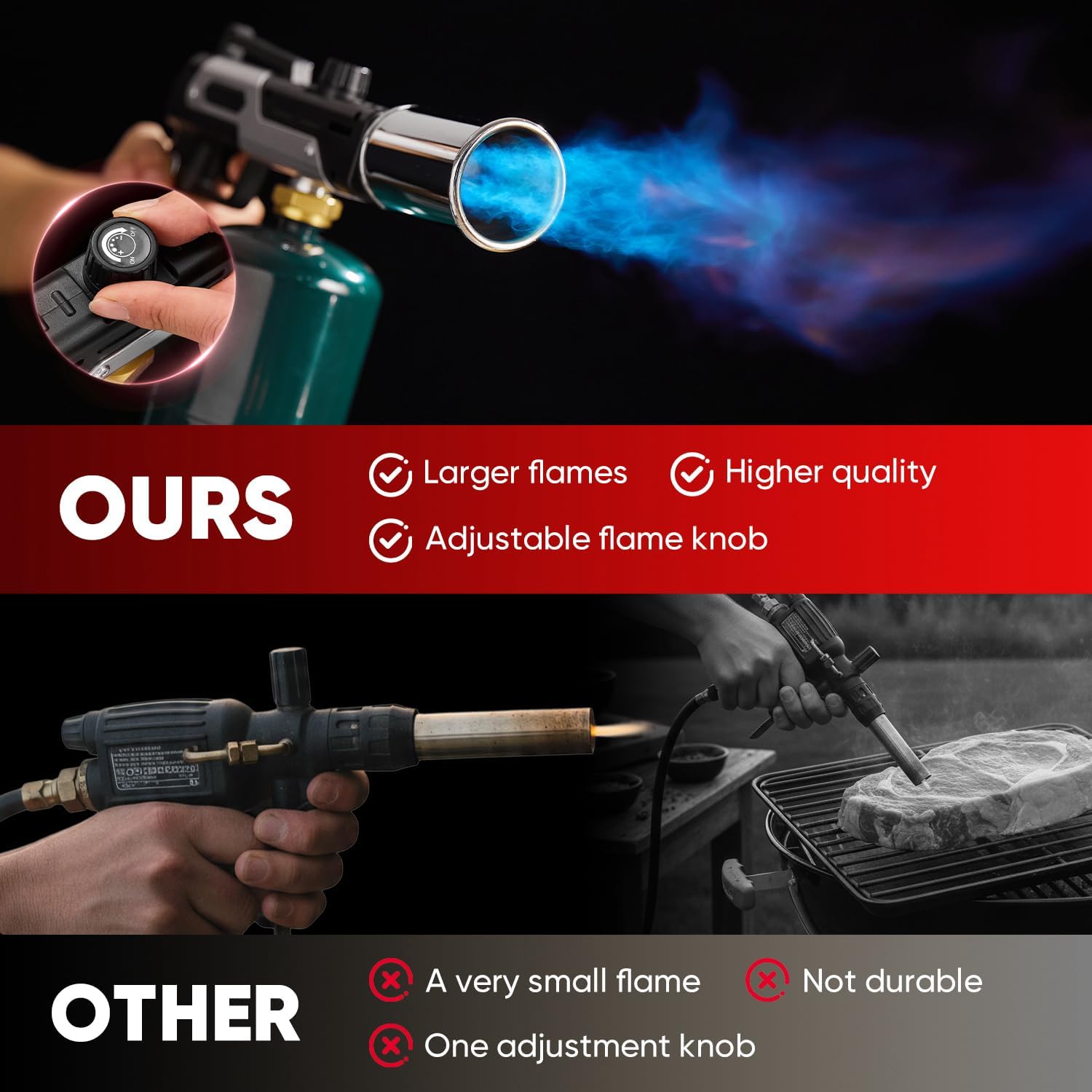 đ„Saker Propane Torch Gun!Elevate your cooking, master your DIY projects, and conquer outdoor tasks with the Saker Professional Propane Torch Gun. Engineered to deliver industrial-grade heat with user-friendly control, this versatile tool transforms how you approach everything from creating restaurant-quality sears on steaks to tackling tough workshop jobs.Important Note: This torch requires a standard propane fuel tank (sold separately) to operate.â FeaturesExtreme High-Temperature Performance: Experience unparalleled power with a flame that reaches up to 3272°F, ensuring you have the necessary heat for the most demanding applicationsăPinpoint Precision Control: The intuitive adjustable valve gives you complete mastery over flame size and intensity, from delicate to infernoăSafety-First Engineering: Built with multiple safety features, including an anti-flare nozzle guard, secure locking mechanism, and robust construction for secure and confident handlingăAll-in-One Versatility: A true multi-tool that excels in the kitchen, garage, workshop, and backyard, eliminating the need for multiple single-purpose toolsăDurable & Ergonomic Design: The professional-grade aluminum body is built to last, while the comfortable, non-slip grip ensures control during extended use.đŻ Ideal for a Multitude of TasksGourmet Cooking: Achieve the perfect crust on sous vide steaks, caramelize desserts, roast vegetables, or toast meringuesăOutdoor & Grilling: Light charcoal, kindling, or fire pits quickly and efficiently, even in slightly damp conditionsăHome Maintenance & DIY: Apply heat for soldering pipes, shrinking tubing, loosening rusty bolts, removing paint, or weeding driveway cracksăCreative Crafts & Hobbies: Ideal for jewelry making, glasswork, leather crafting, and other projects requiring precise, localized heatăđ How to UseFuel Up: Attach a standard propane tank (not included) securely to the torch's valveăCheck Safety: Ensure the safety lock is engaged until you are ready to igniteăSet the Flame: Use the control knob to set your desired flame size before ignitionăIgnite Safely: Point the nozzle in a safe direction, away from people and flammables, and igniteăComplete Your Task: Apply the flame as needed for your projectăShut Down & Store: Turn off the fuel valve completely, detach the propane tank after cooling, and store in a cool, dry placeăâ ïž Important Safety & Compatibility NotesFuel: Designed for use with standard propane fuel tanks only. Tank is NOT included and must be purchased separatelyăVentilation: Always use in a well-ventilated areaăSafety Gear: It is recommended to wear safety glasses when operating the torchăSurface Protection: Use on a heat-resistant surface and keep away from all flammable materialsăRead Manual: Please read all instructions provided before first use.đŠ Whatâs in the Box?1 x Saker Propane Torch Gun