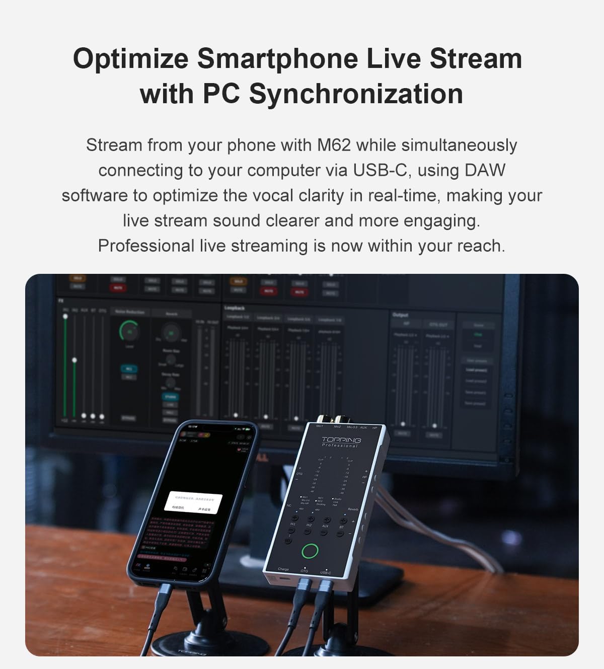 The TOPPING M62 is a next-gen portable audio interface built for creators. With dual mic inputs (48V phantom power), ultra-linear preamp (88dB gain), and smart audio processing including AI noise reduction, auto gain, and reverb, it delivers clear and professional sound. Connect via USB-C, OTG, Bluetooth aptX-HD, or AUX for flexible streaming and recording. Powered by a 5000mAh battery, it offers up to 8.5 hours of performance—perfect for podcasts, live streaming, and field recording.