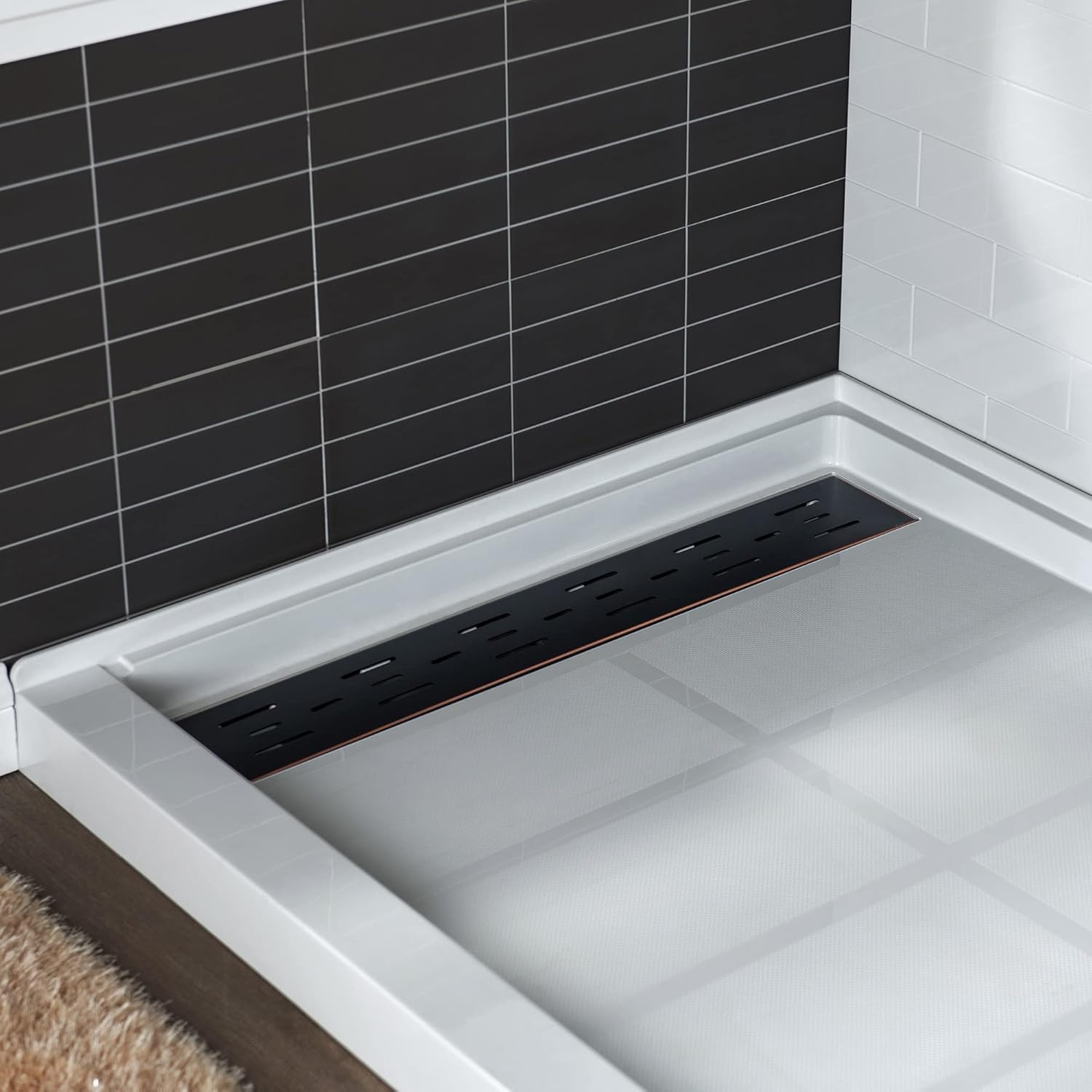 WOODBRIDGE Solid Surface Shower Base with Recessed Trench Side Including Oil Rubbed Bronze Linear Drain Cover L x W x H, 60" L x 36" W x 4" H,Left Drain White Color